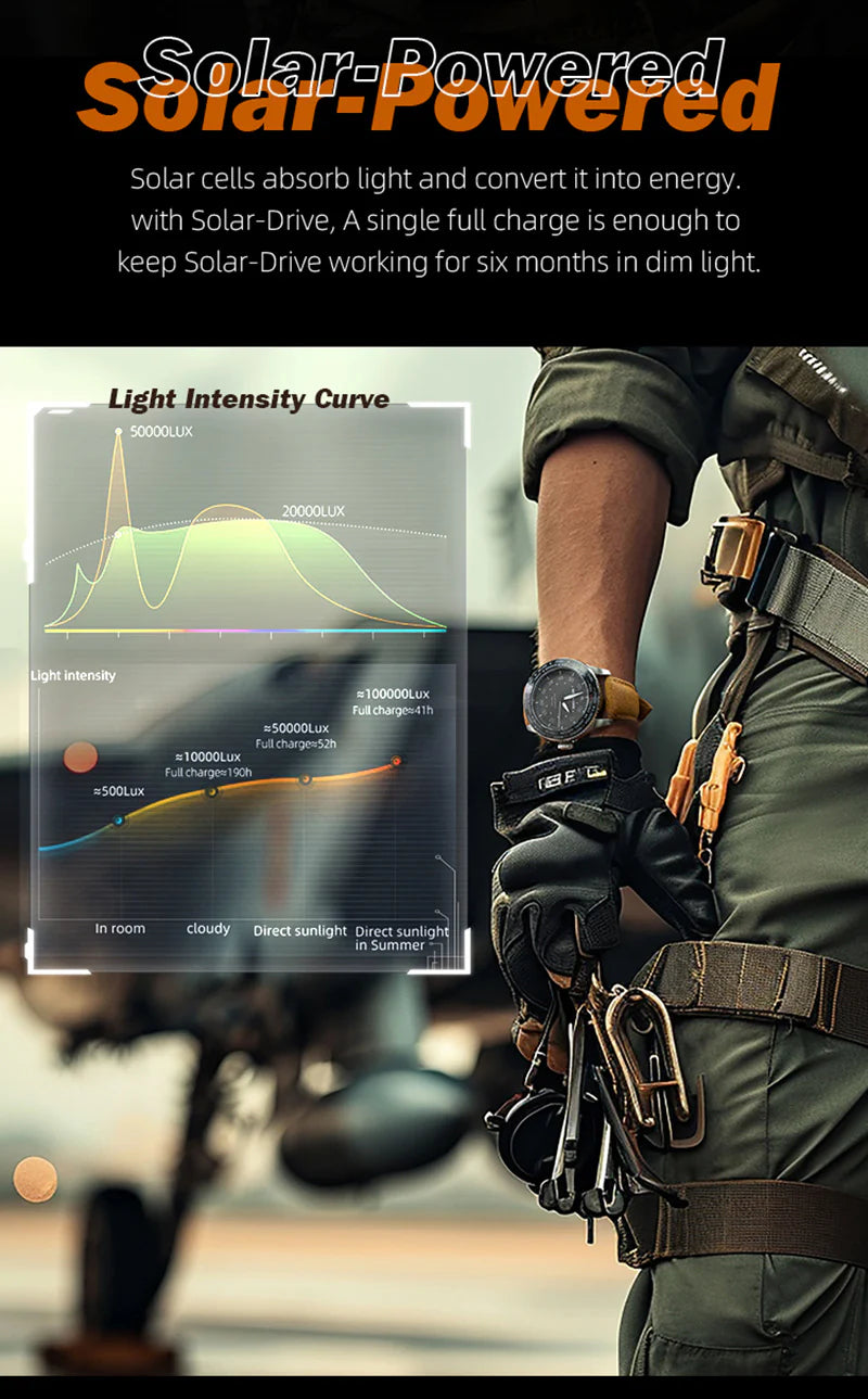 Die MACH verfügt über ein solarbetriebenes Uhrwerk, das nach voller Ladung bis zu 180 Tage Leistung liefert. Mit einer monatlichen Genauigkeit von ±30 Sekunden behältst du die Zeit im Griff. Das Zifferblattdesign sorgt für klare Ablesbarkeit bei Tag und Nacht.